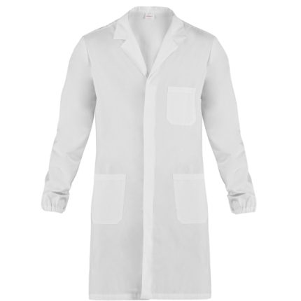Men’s work coat with covered button closure, open collar, full back., Two patch pockets and a small breast pocket, without
