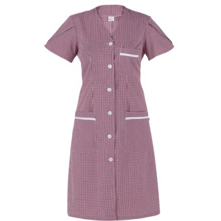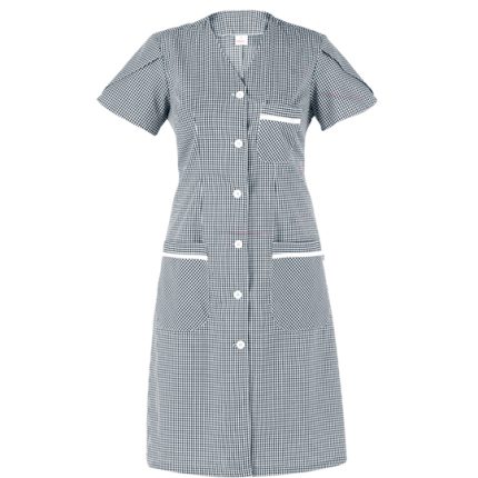 Work coat with covered buttons front closure., Breast pocket and two lower pockets, elasticated cuffs, contrasting colour stitching.