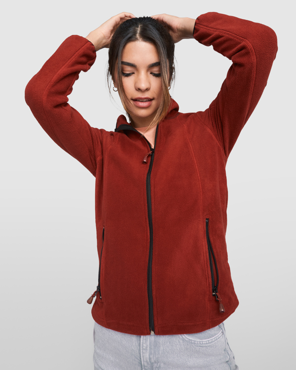 Hanorac micropolar pentru sporturi în aer liber, cu talie înaltă și mâneci largi cu coaste contrastante.