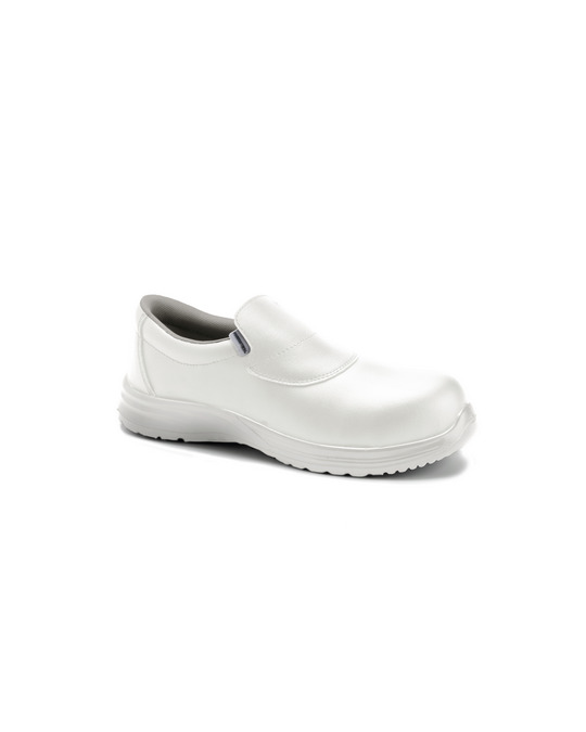 Food industry footwear with white water-repellent microfibre upper, inner lining, padded girth, composite toe cap, breathable anti-static removable insole, single density anti-slip polyurethane outsole., METAL FREE FOOTWEAR