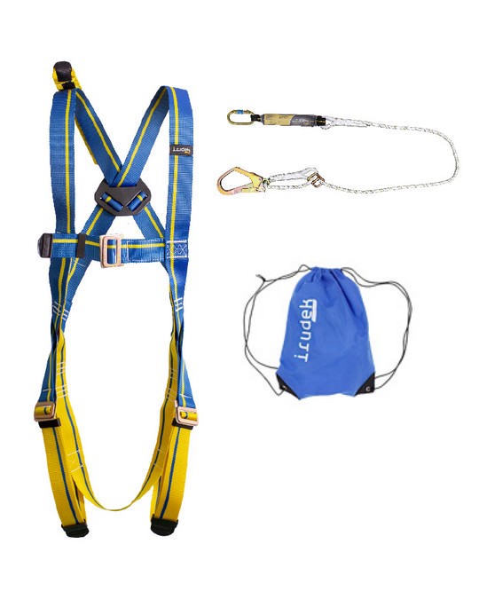 The kit includes:, – LIGHT PLUS 1 harness: back attachment, polyester extension strap, adjustment buckles on chest and thigh straps, plastic protection at the ends of the straps, steel components with salt spray test resistance of 120 hours, compared to the 72 hours required by the standard;, – energy absorber 364: with 2 m long adjustable rope and equipped with a 981 carabiner at the end of the absorber and a 39 carabiner at the end of the rope;, – Light bag in nylon for carrying., USE: Roofing and building, industrial maintenance, structures and ladders