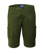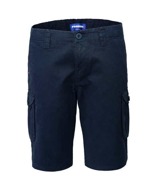 Work Bermuda shorts, with adjustable elastic at the waist, flap closure with zip and button on the belt., Two front inside pockets, two large bellowed side pockets with flap and button closure, two welt back pockets with flap and button closure.