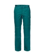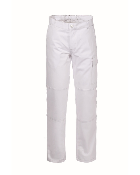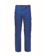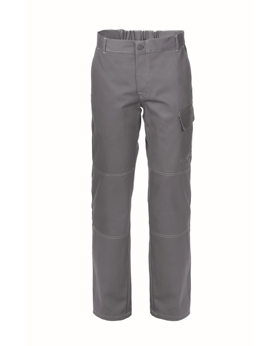 Work trousers with elasticated waistband at the back, uncovered zip and button fly closure two internal front pockets, one back pocket on the right with button closure, one tape measure holder, one pen holder and one side pocket on the left closed with flap and Velcro, contrasting colour stitching., *** SIZE 4XL AND 5XL ONLY AVAILABLE FOR COLOURS 01 BLUE AND 12 GREY ***