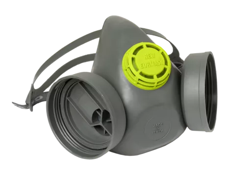NEW EURMASK DUO. Half-mask in TPE thermoplastic rubber, with 2 screw thread for 2 filters (not included), with soft silicon exhalvation valve, fabric and rubber elastic strap