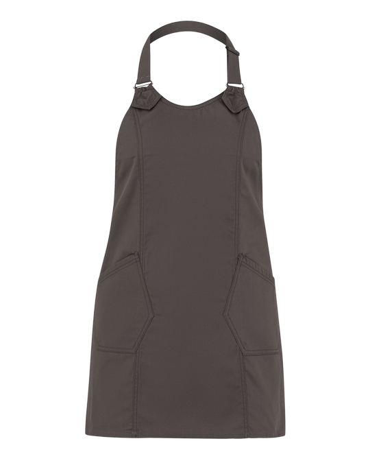 The Virginia apron is made of classic poly-cotton gabardine. It has a linear but of great impact taste, distinguished by geometric lines, highlighted by two-needle stitching with contrasting yarn., It features two pockets, fixed with matching bar tacks; the halter is adjustable through two buckles. The Virginia apron is available in 7 colour options: black, blue, grey, taupe, burgundy, military green and brown.