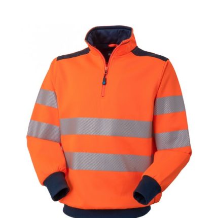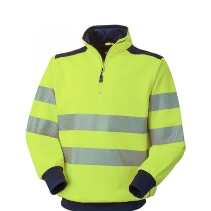 High visibility sweatshirt with high neck with short plastic zip closure. Inserts on the shoulders, sweatband and bezel at the