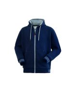 Sweatshirt with plastic zip central closure, hood closed with drawstring, inside of the hood in contrasting colour, sweatband inside the collar., Elasticated knit cuffs and waistband with contrasting colour inserts and a lower right-hand welt pocket with zip closure, two large front pockets.