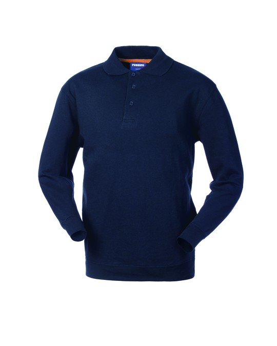 Sweatshirt with polo collar closed with three buttons, sweatband inside the collar, straight armholes., Cuffs and waistband in elastic ribbed knit 2/1 with double stitching.