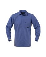 Work shirt with traditional covered buttons front closure., Chest patch pocket with flap and Velcro closure, back yoke., Jacquard label with pictogram sewn on the right sleeve cuff, long sleeve with cuffs fastened with buttons, various yellow bar tacks.