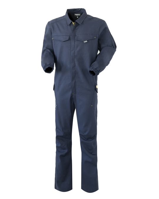 Overalls with central closure with double-slider zip covered by a flap closed with Velcro., Shirt collar, two breast pockets closed with flap and Velcro, two side pockets closed with flap and Velcro. Front and back yoke, elasticated cuffs and elbow pleats for extra comfort, elastic at the waist on the back., Jacquard label with pictogram, pleats at the knees for added comfort, various yellow bar tacks.