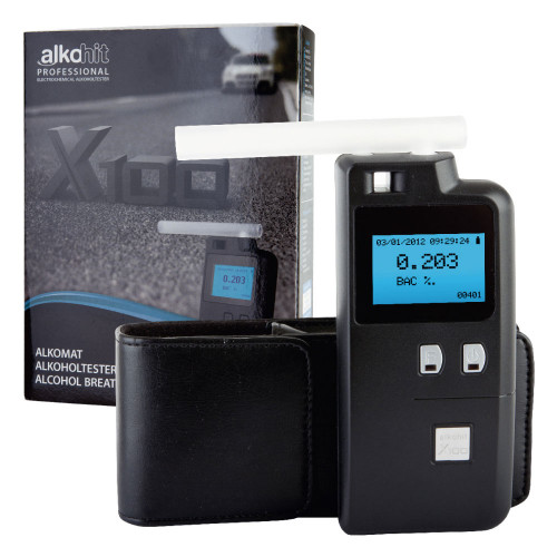 Aparat de baza, Alkohit X100, baterie Li-Ion 1000 mAh, 3.7 V, baterie plata CR 1200 (pentru memorare data si ora), 10 buc.mustiucuri, ambalate individual, 2 capete cu palnie, incarcator pentru priza electrica, cablu pentru cuplarea la calculator, etui pentru alcooltest. Aparat cu mustiuc, ecran pentru citirea datelor masurate, buton de OFF/ON (pentru masurare prin intermediul capului de palnie), buton pentru functia F (pentru masurare prin intermediul mustiucului). Memorarea 4000 masuratori pentru trimitere catre PC.