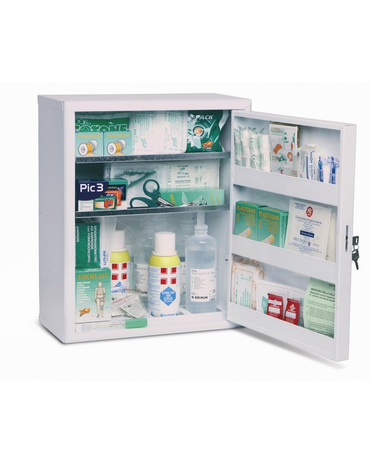 3 compartments and 2 internal shelves with lock with key. Carbon steel cabinet, painted with epoxy powder, oven-baked at 180°, rounded edges, 2 steel shelves, door with three accessory holders, removable bottle holder base, lock with key. SIZES: 483x402x202 mm., For companies and production units with 3 or more workers – group A and B., CONTENTS:, • 1 copy Min. Decree 388 dated 15.07.03, • 5 pairs of sterile gloves, • 1 mask with splash shield, • 3 bottles sterile saline solution 500 ml EC, • 2 bottles of disinfectant 500 ml iodine povidone 10% iodine PMC, • 10 packets of sterile gauze pads 10×10 cm, • 2 packets sterile gauze pads 18×40 cm, • 2 sterile cloths 40×60 cm DIN 13152-BR, • 2 pairs sterile tweezers, • 2 packs of cotton wool, • 1 pack of net elastic bandage, • 2 Plastosan 20 assorted plasters, • 1 pair of bandage-cutting scissors, • 2 reels adhesive plaster m 5×2, 5 cm, • 3 haemostatic laces (tourniquets), • 2 disposable instant ice packs, • 2 bags for medical waste, • 1 EC digital clinical thermometer, • 1 Personal sphygmomanometer with phonendoscope, • 4 gauze bandages 350×10 cm, • 1 PIC 3 case containing: 3 sachets of liquid soap, 3 sachets of PMC disinfectant wipes, 2 sachets of ammonia wipes, • 1 hand sanitizer gel 100 ml, • 1 gold/silver isothermal blanket 160×210 cm, • 1 triangular non-wollen sling/cloth 96x96x136 cm, • 2 prepared 3.5 g sterile burn gel, • 2 elastic bandages 400×6 cm DIN 61634, • 1 sterile pad bandage 8×10 cm DIN 13151 M