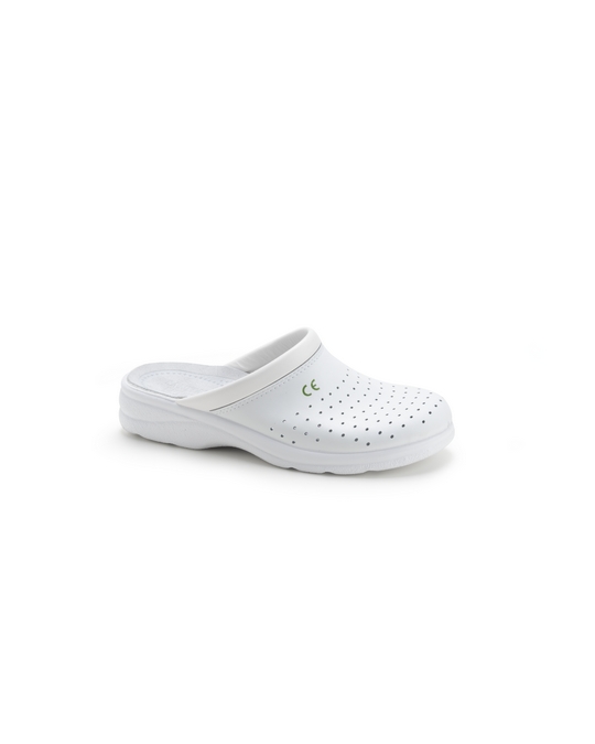 Clog in perforated, breathable white leather, ecological, lightweight and flexible, high abrasion resistance, padded instep girth, anatomical and breathable leather insole, anti-slip and anti-static single density polyurethane outsole with heel energy absorption.