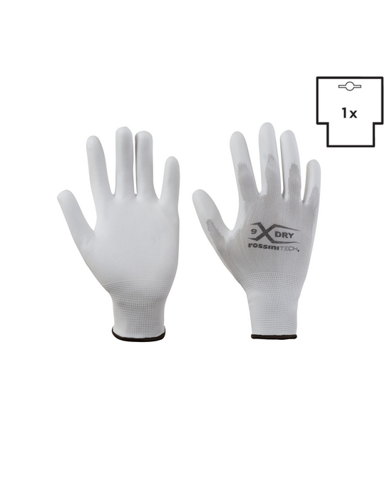 Seamless knitted polyester glove (13g). Polyurethane coated (open back). Thin, light and ergonomic. Precision and dexterity in fine applications.