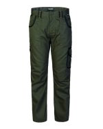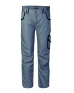 Work trousers with adjustable elastic waistband, flap closure with zip and button on the belt, double fabric reinforced belt loops., Two front patch pockets, one side patch pocket on the left with flap and Velcro closure, two back patch pockets with flap and Velcro closure, tape measure pocket and small patch pocket with Velcro closure on the right side.