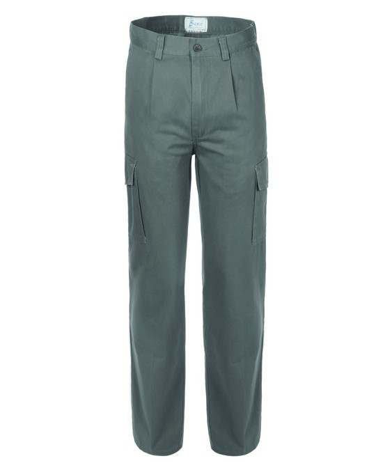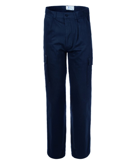 Work trousers with zip fly closure and button on the belt., Two expandable side patch pockets with side and central bellows closed with flap and Velcro, two internal front pockets and two internal back pockets closed with flap and Velcro.