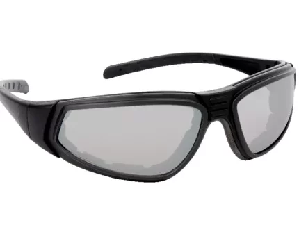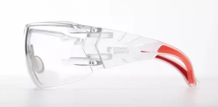 FOX safety glasses. Clear polycarbonate lens, anti-UV and anti-scratch treatments, auto-adjustable temples made of comaterial, vented temples with a thin